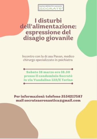 Il corpo insegnante e i genitori sono invitati SABATO 16/3 alle ore 16.30 presso il "Condominio Socrate' " in Via Vandalino 132,all'evento "I disturbi dell'alimentazione: espressione del disagio giovanile" gestito dalla Dottoressa Medico Chirurgo Psichiatra Pavan Sara, esperta del tema ed operante in una importante struttura ospedaliera torinese. La dottoressa si mette a disposizione per dialogare con le famiglie, con gli insegnanti e con i ragazzi.